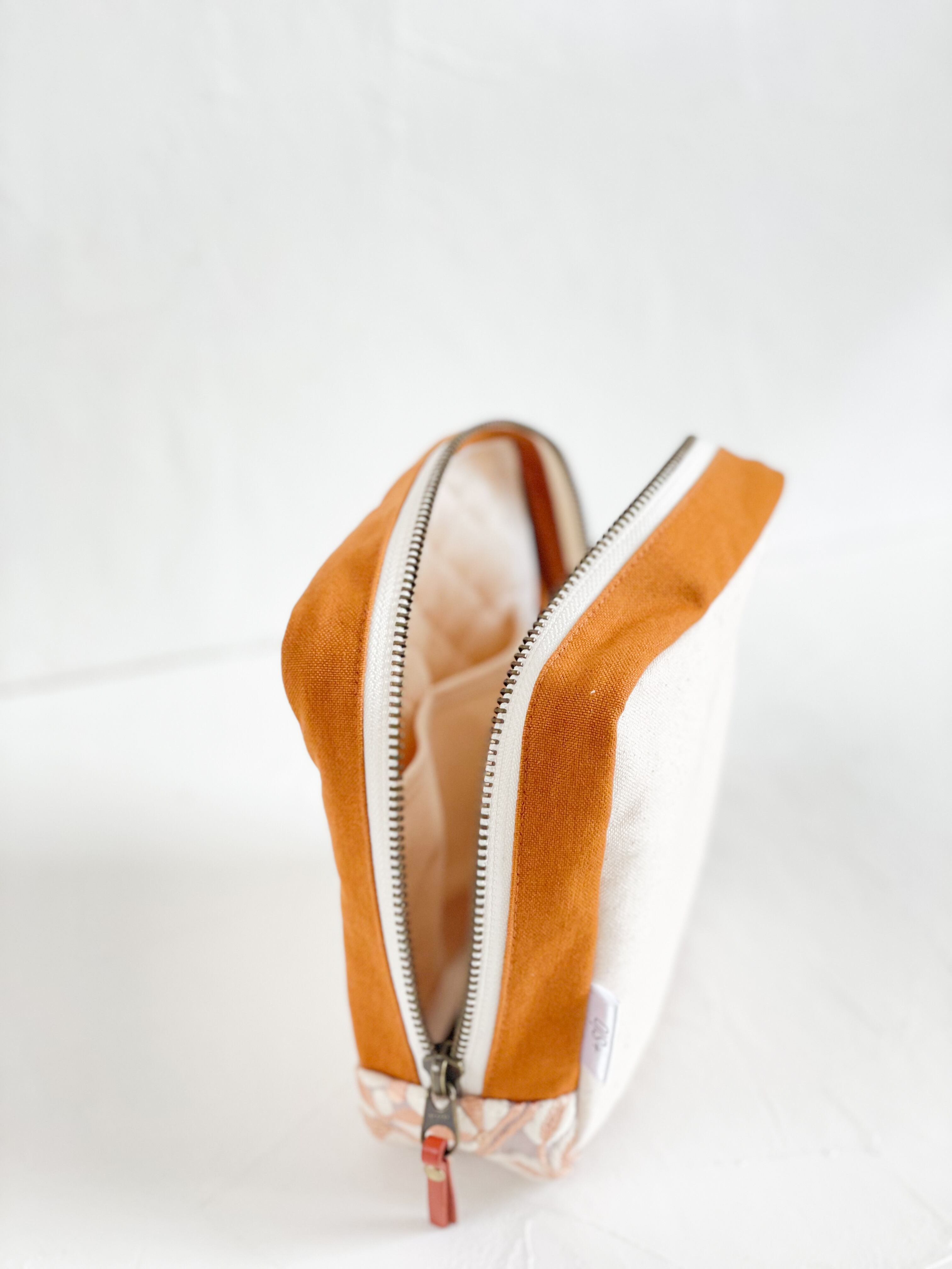 柔らかい帆布とキルティング生地でふっくらと仕立ててあり、口がガバッと開くので、中身の出し入れがとてもスムーズです。内側にはサイズの違うポケットがあり、小物を整理しやすく、ストレスなく使えます。お化粧道具や日常使いのアイテムを収納して鞄の中をスッキリさせることができます。