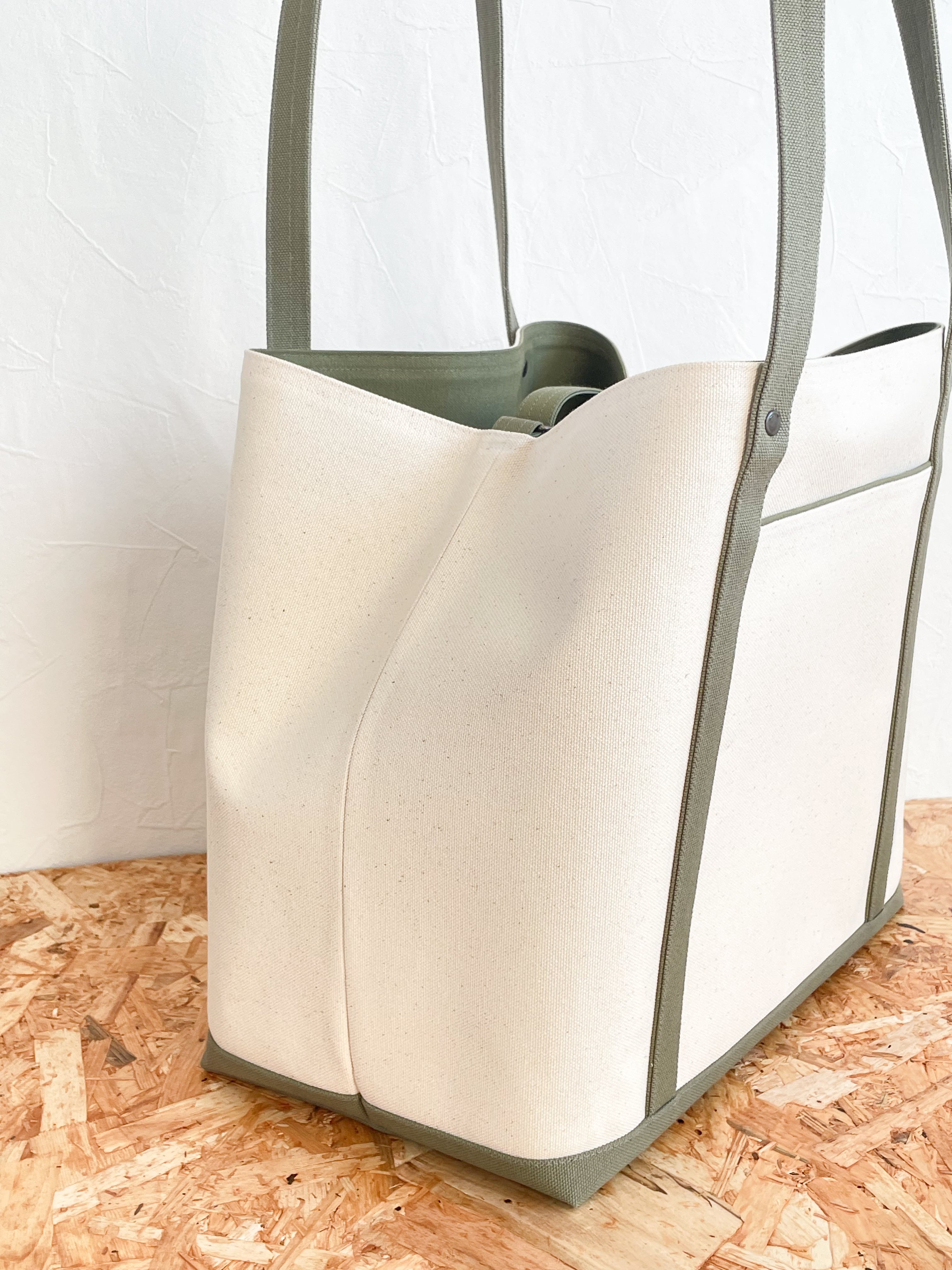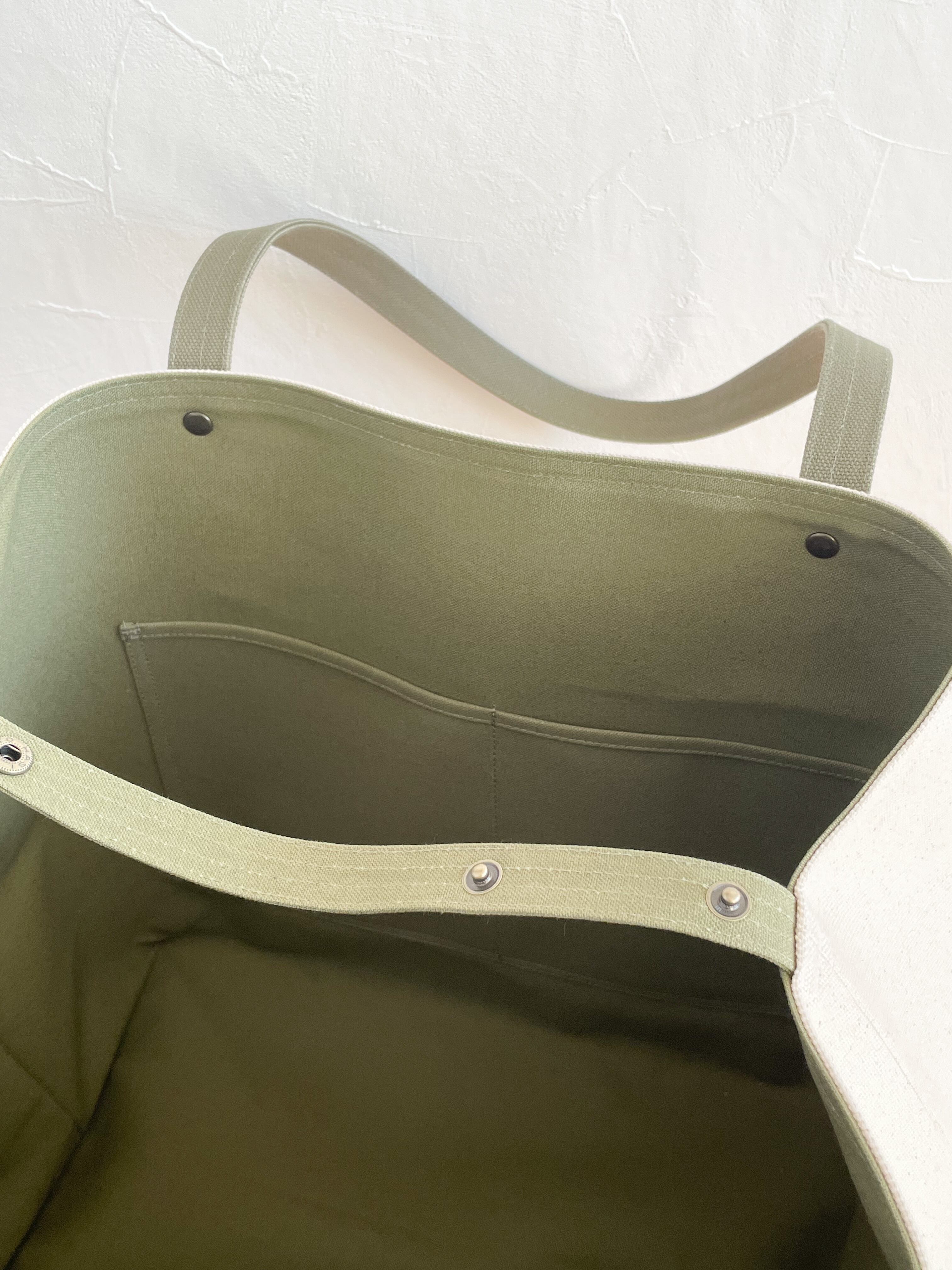 生成りのやさしい風合いに、落ち着いたカーキを効かせたトートバッグ。
