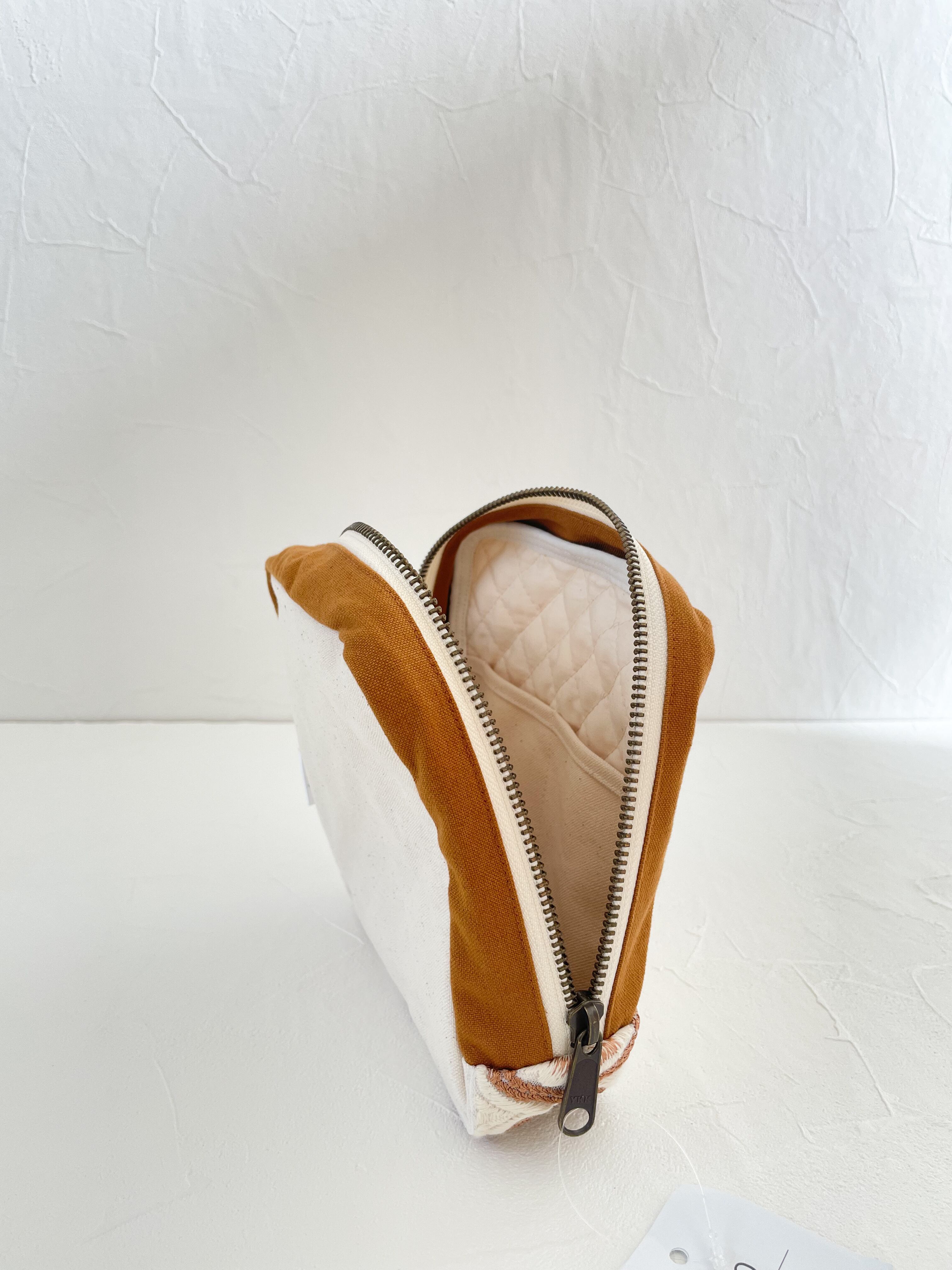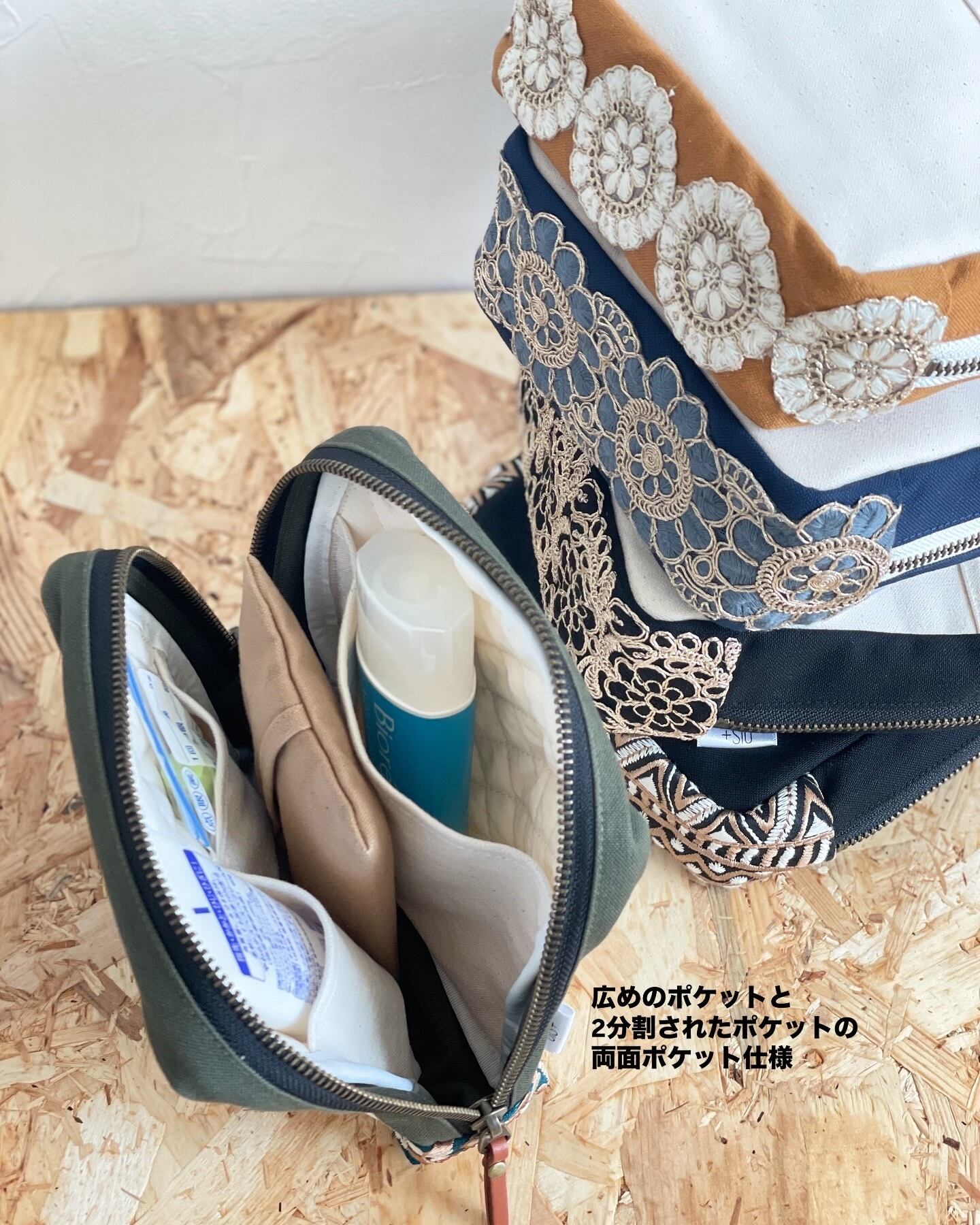 柔らかい帆布とキルティング生地でふっくらと仕立ててあり、口がガバッと開くので、中身の出し入れがとてもスムーズです。内側にはサイズの違うポケットがあり、小物を整理しやすく、ストレスなく使えます。お化粧道具や日常使いのアイテムを収納して鞄の中をスッキリさせることができます。