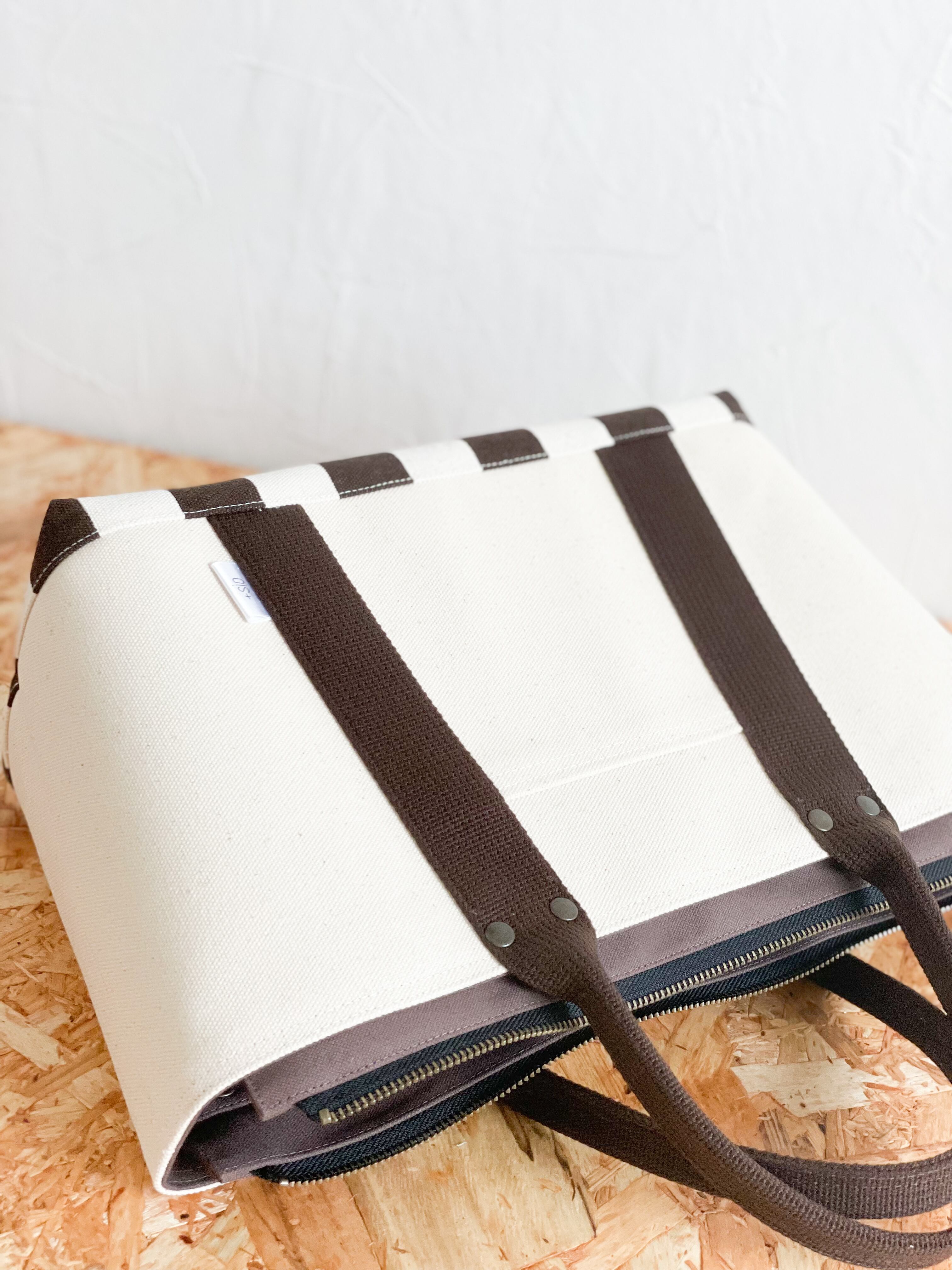 丈夫な帆布生地と太めの持ち手を組み合わせた鞄です。