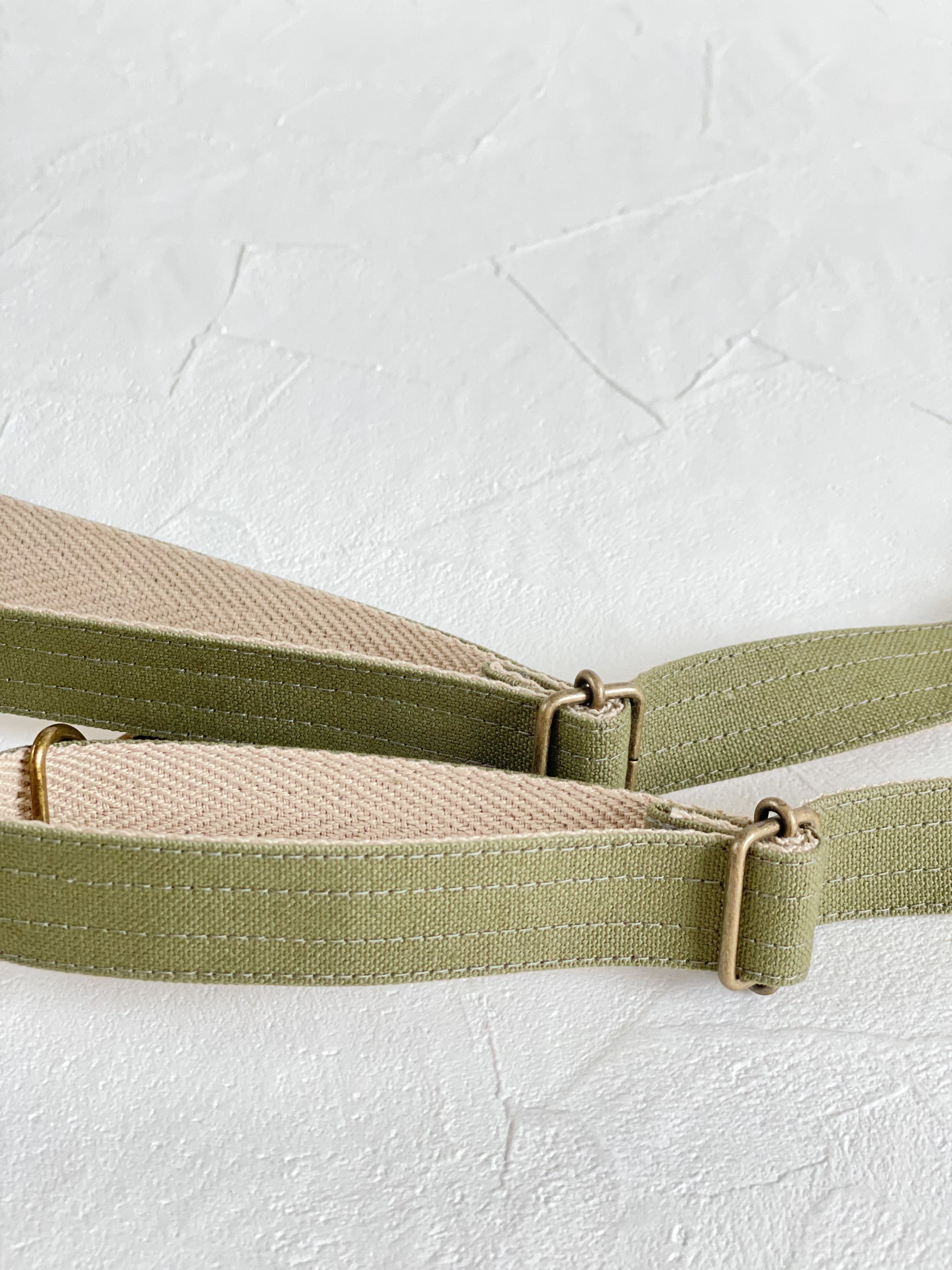 カジュアルなコーデに合わせやすい、インド刺繍リボンと帆布のショルダーストラップです。